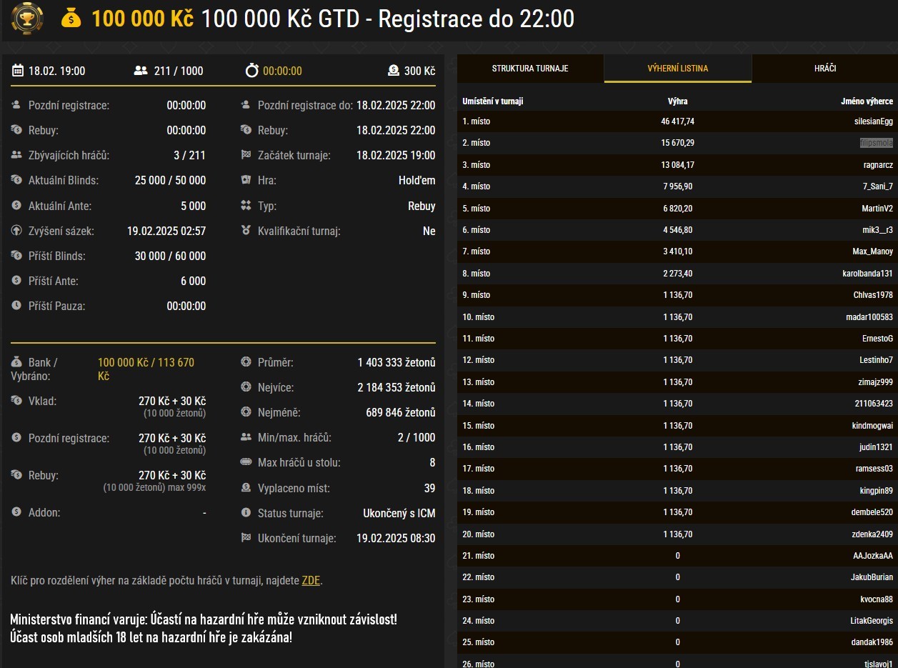 V úterním turnaji s garancí 100 000 Kč vyhrál SilesianEgg 46 417 Kč!