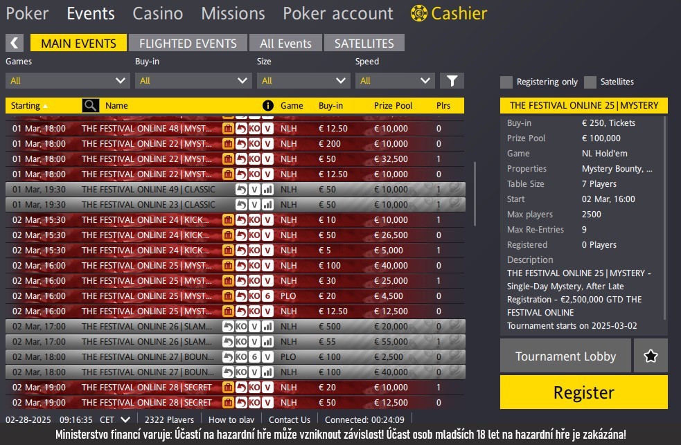 Kompletní nabídku najdete v lobby Fortuna Poker. Další informace k sérii najdete zde: Fortuna Poker: The Festival Online s celkovou garancí přes 60 milionů Kč!