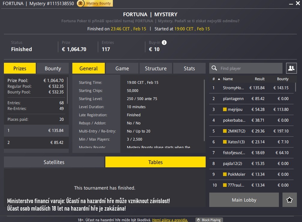 Sobota 15. února přinesla, co se týče parametrů, stejný turnaj. Fortuna Mystery opět nabídl hru o garantovaných €1 000 za vstupné €10. Turnaj si nenechalo ujít 68 unikátních hráčů, kteří dohromady vytvořili 117 entries. První místo a největší část prize money urval hráč StromyHondurasu, jenž si přilepšil o €279 (PM €135 + MB €144).