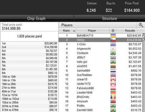 Tentokrát se stane středem naší pozornosti turnaj $22 Mini Sunday Million, jehož garantovaný $125tisícový prize pool zlákal k účasti 8.245 hráčů, což je zhruba o šest a půl tisícovek registrací více, než kolik jich bylo v předešlých edicích Kickoffu a Bigger $109 utvořeno dohromady. Výplatní struktura diktovala odměnit vítěze částkou ve výši $20.843, o kterou Vinklárka ve vzájemném souboji připravil ukrajinský hráč s přezdívkou BaNdErA713. Když bylo po všem, zamířilo na Vinkyyho účet $14.240.