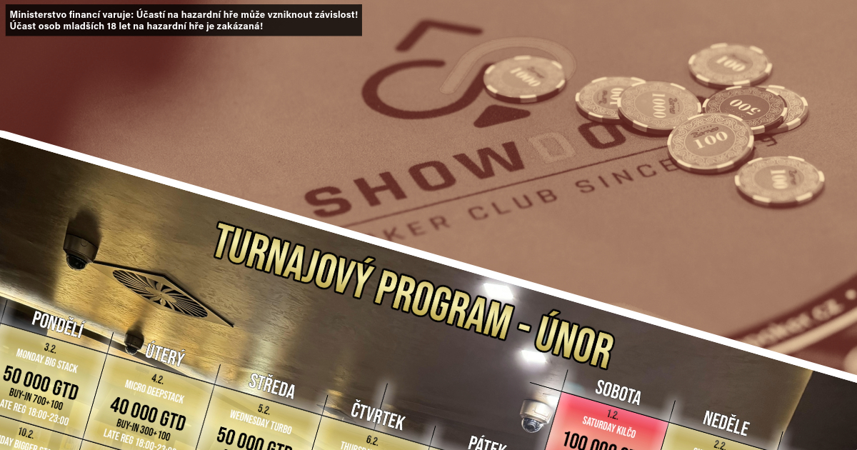 V únorovém programu naleznete stálice Showdownu, jako je pravidelný páteční Super Friday s garancí 100 000 Kč a buy-inem pouhých 700+100, nebo třeba sobotní Kilčo. Nechybí ani novinky, například čtvrteční 150 000 GTD s buy-inem 1 500+100.