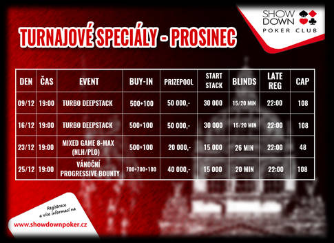 Na turnajové speciály se v Showdownu můžeš těšit během každé prosincové neděle. Už během té první byl odehrán Win the button tournament a další tři zajímavé akce tě ještě čekají. Vždy začínáme v 19:00 hodin s pozdní registrací do 22:00 a samozřejmostí jsou i dvě re-entry v každém z těchto turnajů. Ale to není vše! Na všech pátečních a nedělních turnajích hráči sbírají body do PZ.cz leaderboardu, přičemž ti nejlepší následně obdrží vouchery do cash game v minimální hodnotě 1.000 Kč.