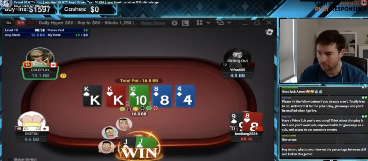 Celou tuhle torturu navíc streamoval pro pobavení lidu, takže jsme v přímém přenosu sledovali, jak se ze seriózní hry stává mechanické klikání na sto padesát turnajů za den, což už nemá s pokerem moc společného.