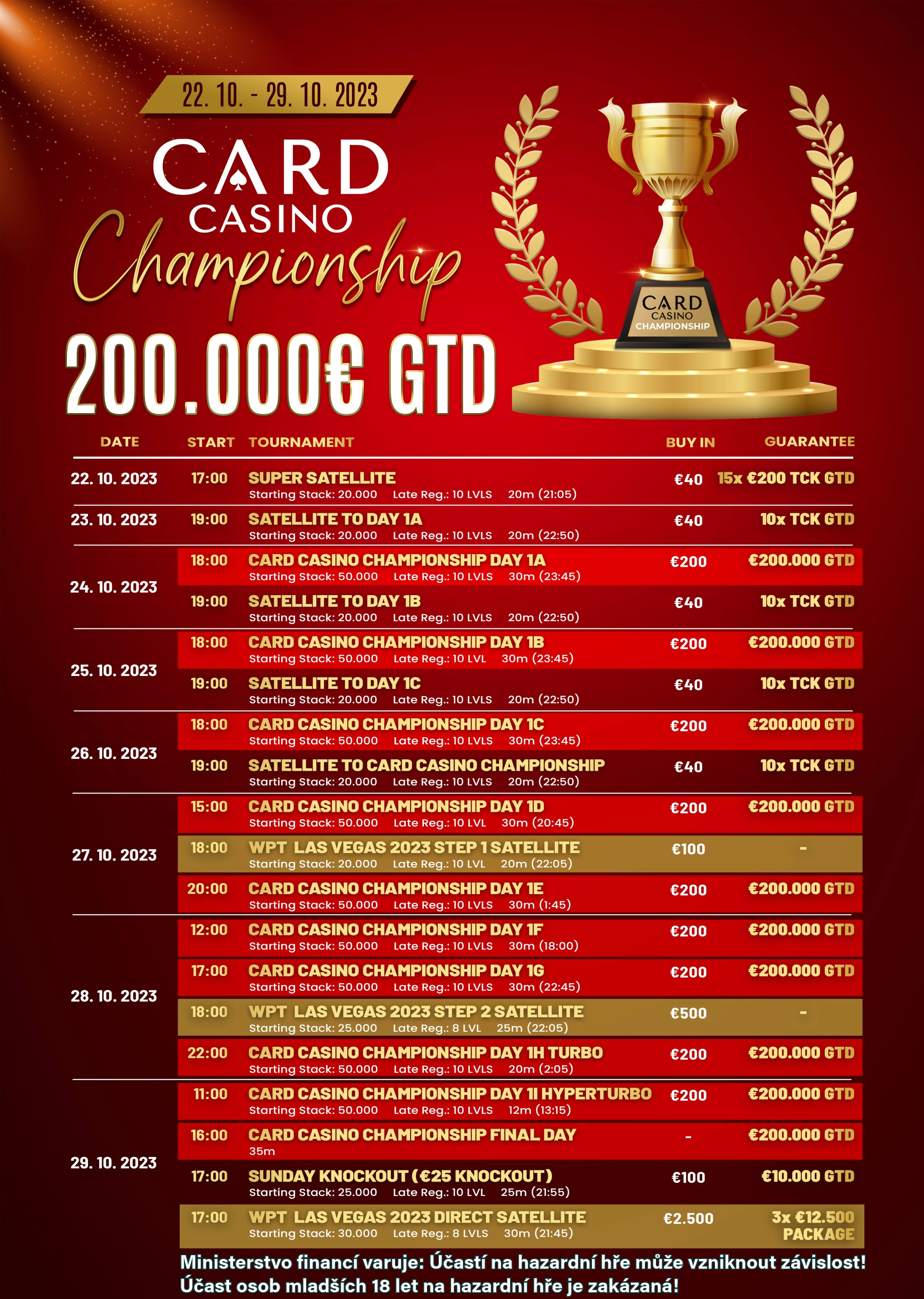 - Soutěží se o 1x jeden vstup v hodnotě €200 do poker turnaje Card Casino Championship s GTD €200.000, který se koná v termínu 27. - 29. 10. 2023, v Card Casino Bratislava, Ivanská cesta 410/26, Bratislava, Slovensko. Vylosován bude jeden výherce