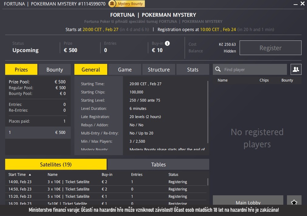 Další podmínky soutěže o 2x jednu €10 vstupenku do turnaje POKERMAN MYSTERY s GTD €600 na Fortna Pokeru. Konání turnaje 27. 2. 2025 (20:00)