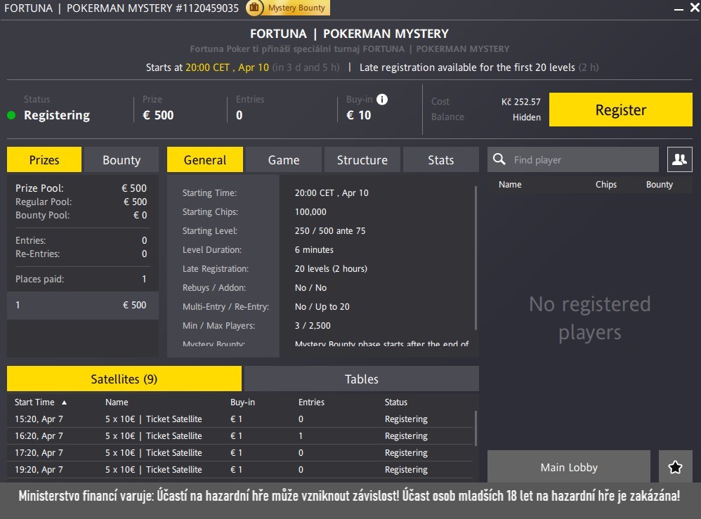 Soutěží se o 2x jednu turnajovou vstupenku v hodnotě €10 do turnaje POKERMAN MYSTERY s GTD €500, který se koná dne 10. 4. 2025 od 20:00 na Fortuna Pokeru. Vylosováni budou 2 soutěžící, každý obdrží jednu vstupenku. Vstupenka je jednorázová a lze ji použít pouze na jeden vstup.