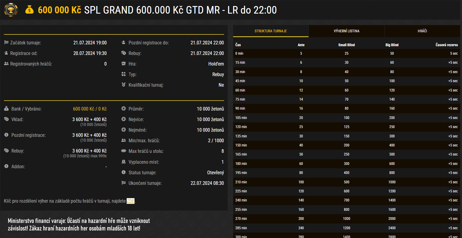 - Cena - 1x vstup do turnaje SPL GRAND GTD 600.000 Kč, buy-in 4.000 Kč (konání neděle 21. 7. 2024, 19:00) na www.synottip.cz