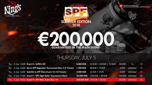 Dnešní program je jasný, ve sváteční Den slovanských věrozvěstů Cyrila a Metoděje bude King's hostit finále €600 High Rolleru a již zmíněný úvodní flight €300 SPF Main Eventu. Souboje o garantovaných €200.000 se rozhoří v 18:00, během dne 1a bude odehráno 16 půlhodinových levelů. Late reg je otevřen během 14 úrovní, startovních 50.000 v žetonech bude k dispozici také formou neomezených re-entry. Všichni přeživší si zajistí účast ve finálovém dni, jehož zahájení je naplánováno na nedělní třináctou hodinu.