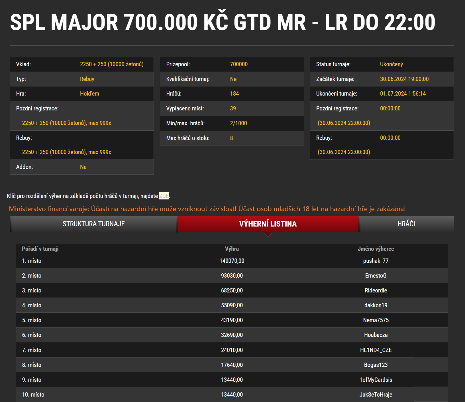 MAJOR měl 184 hráčů, 289 celkových vstupů, a hrál se téměř do dvou hodin ranních. Garance se v tomto případě nepřebrala zhruba o 50.000 Kč.