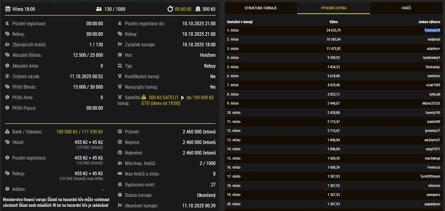 Z tohoto turnaje také pramenila největší odměna za první místo. Tu shrábl "Yuminek29", který inkasoval 24 635 Kč. Opět přehled všech výherců tohoto pravidelného online pokerového turnaje naleznete níže v tabulce.