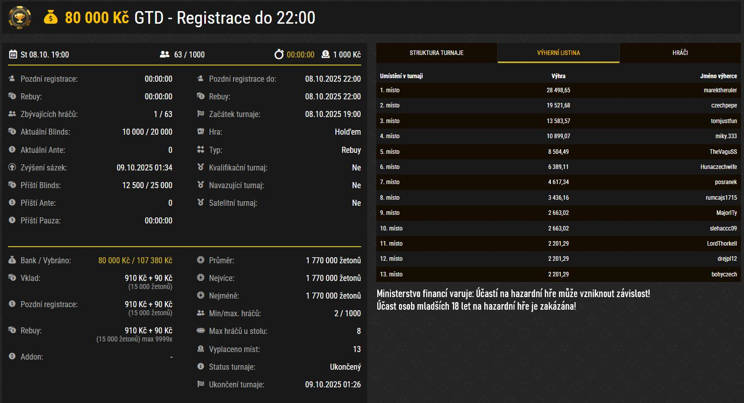 Výsledky turnajů 80K GTD z pracovního týdne na SynotTip Poker 6. - 10. 10. 2025