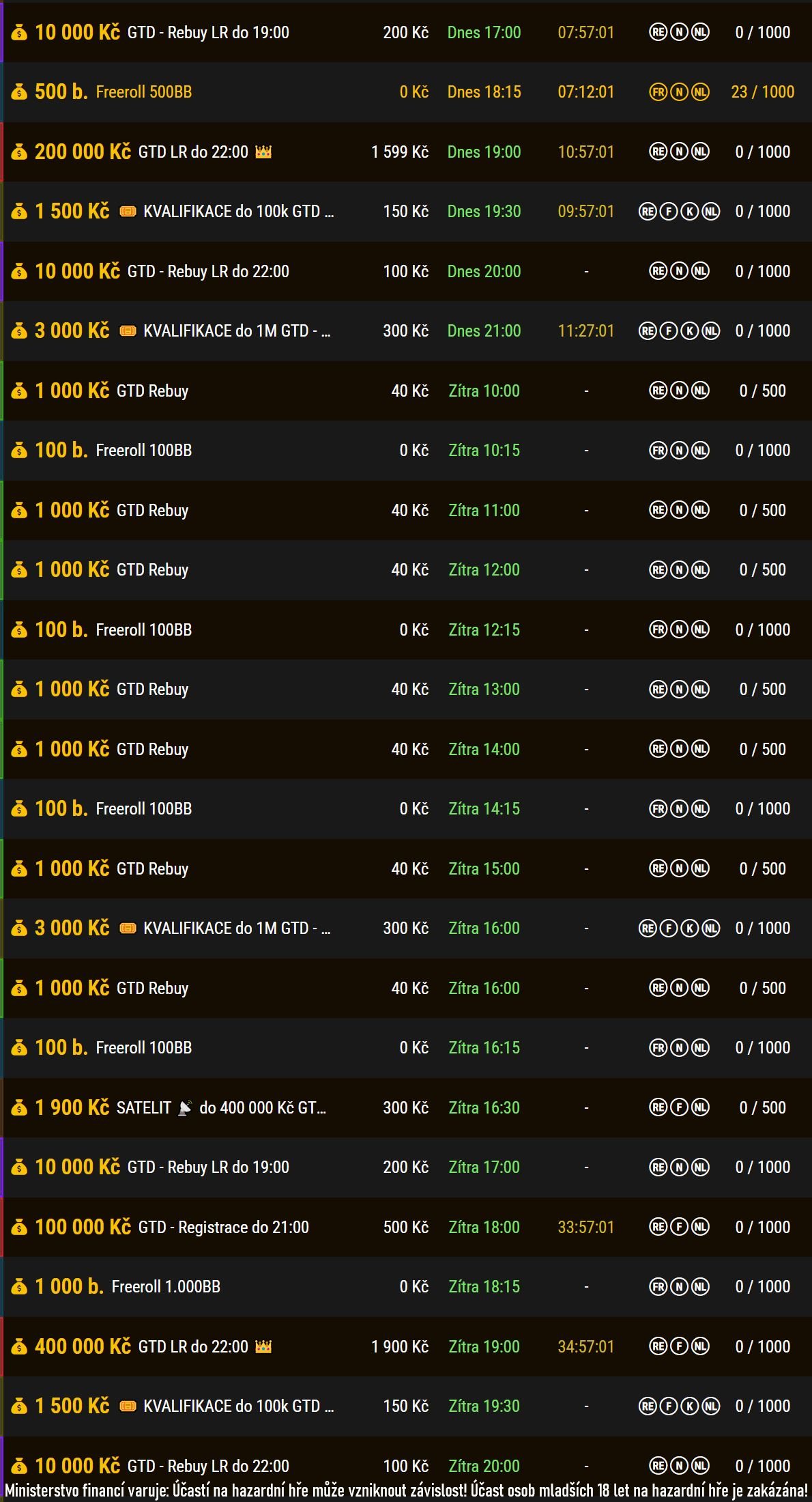 Zaměříme se na dva největší turnaje, které se hrají pravidelně každý den. Tím prvním z nich je turnaj s garancí 80 000 Kč a vstupným 1 000 Kč. Ten startuje standardně každý všední den od 19:00.
