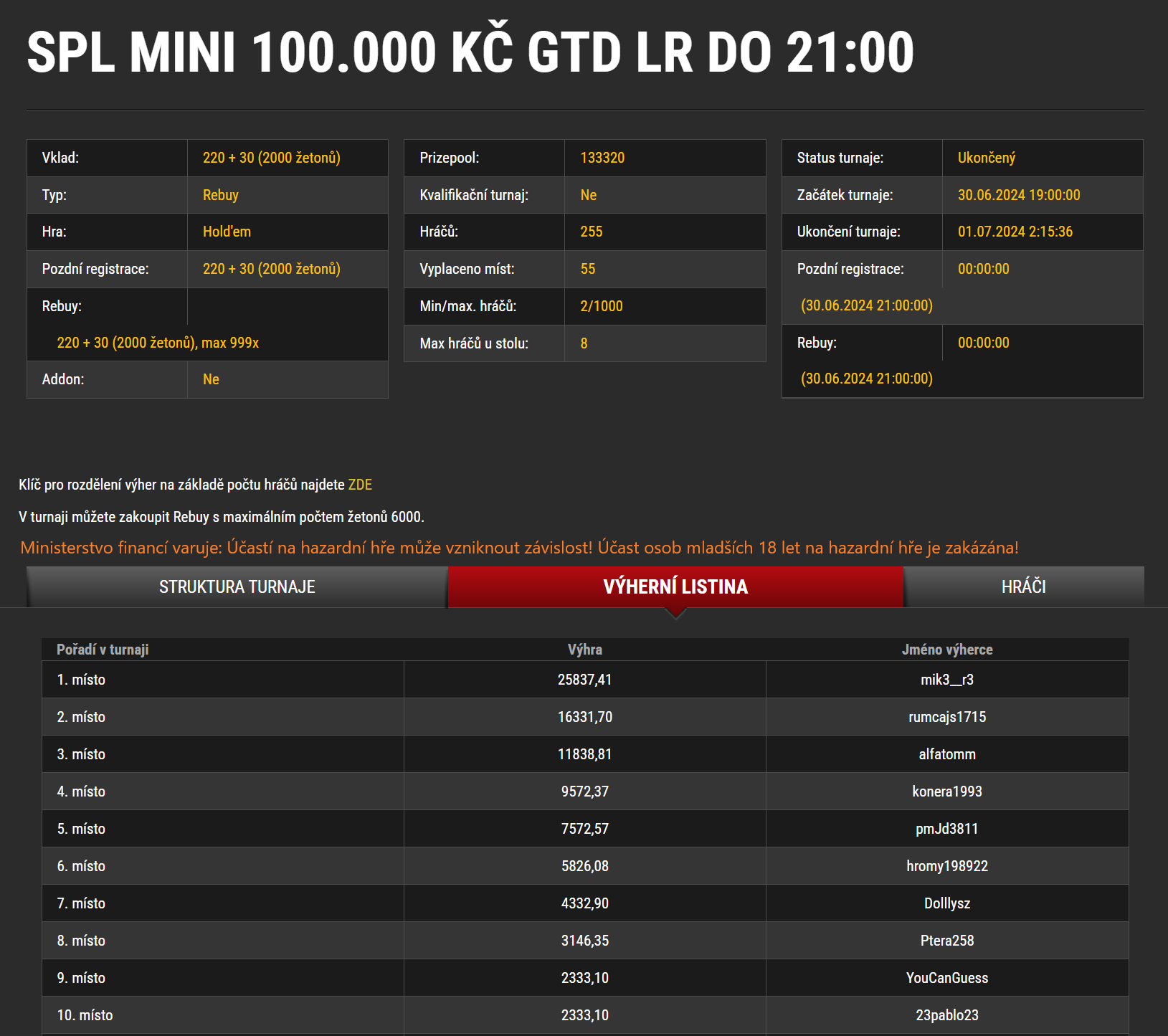 Jak jste si mohli přečíst z naší tabulky, turnaj si připsal celkem 267 entries a hrálo se tak o 413.850 Kč. Nejlepší točivou formu předvedl hráč s nickem "KappaDonna", který si tak za 1. místo připsal slušných 87.239 Kč. Svůj vklad tak znásobil více než 50x!