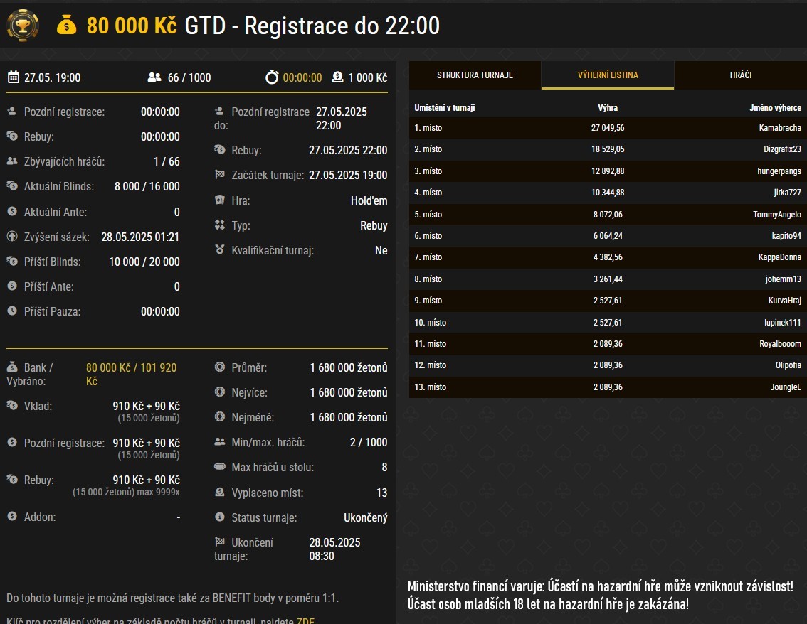 - Neděle 1. 6. 2025 – SPL MAJOR, GTD 800 000 Kč, buy-in 2 999 Kč