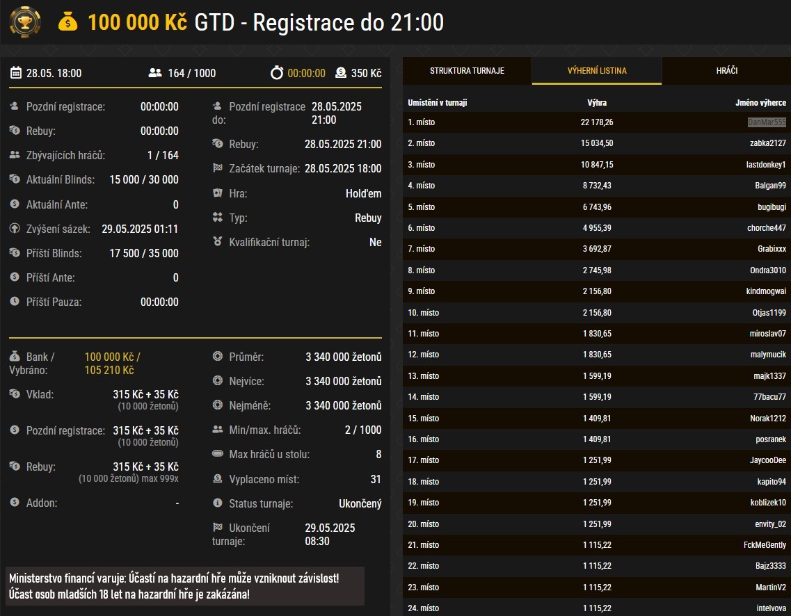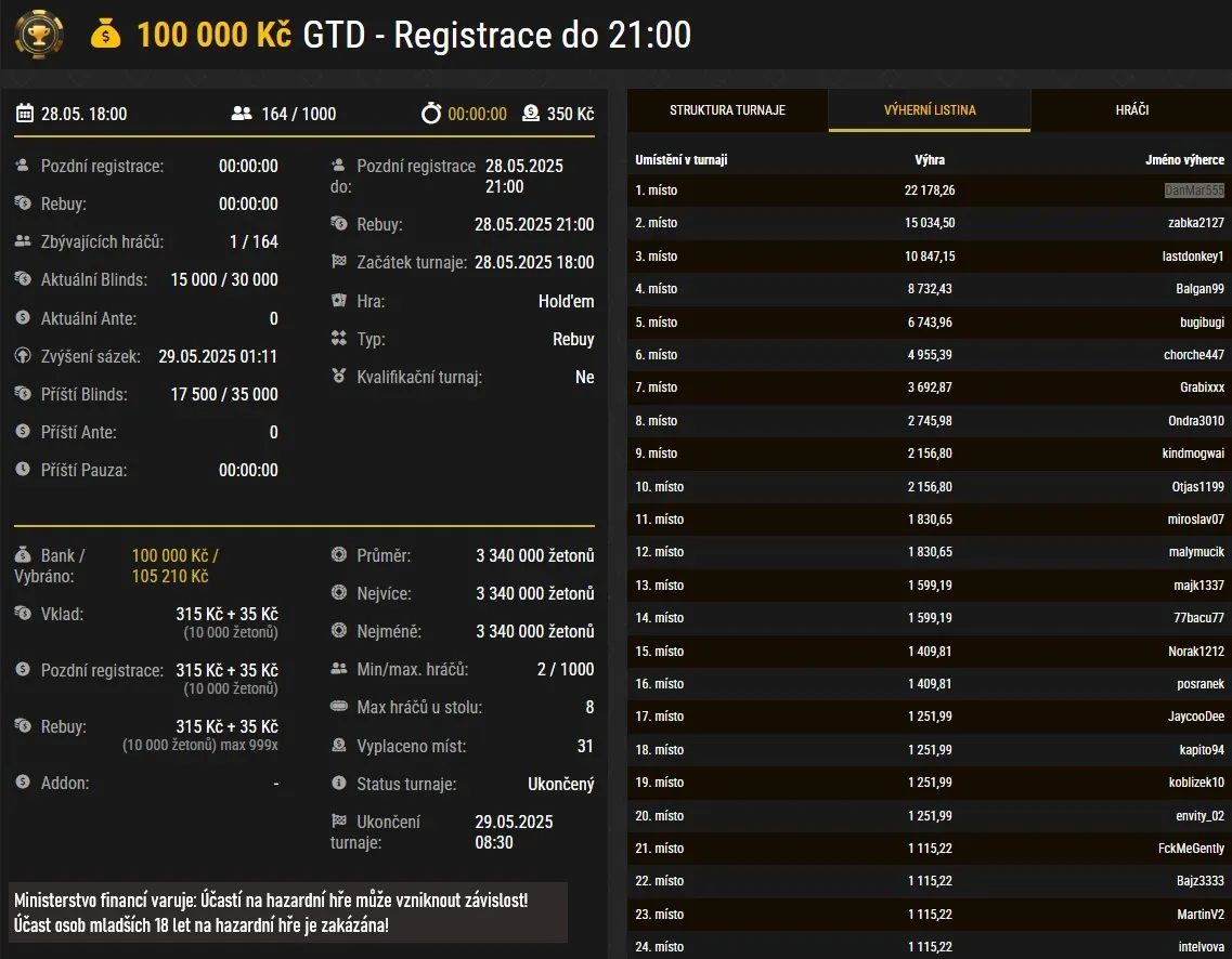 Do pravidelného turnaje s GTD 100 000 Kč a buy-inem 350 Kč naskočilo tento týden nejvíce hráčů ve středu. Do hry se zapojilo 164 hráčů, kterým se nakonec podařilo zdolat garanci turnaje a vybrali PP 105 210 Kč. Největší odměnu v hodnotě 22 178 Kč si z banku odměn (celkem 31 placených pozic) pro sebe ukrojil hráč DanMar555.