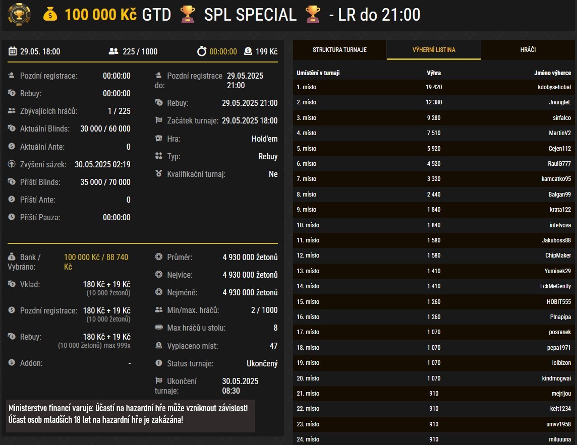 - Sobota 31. 5. 2025 – SPL SIDE EVENT, GTD 400 000 Kč, buy-in 1 999 Kč