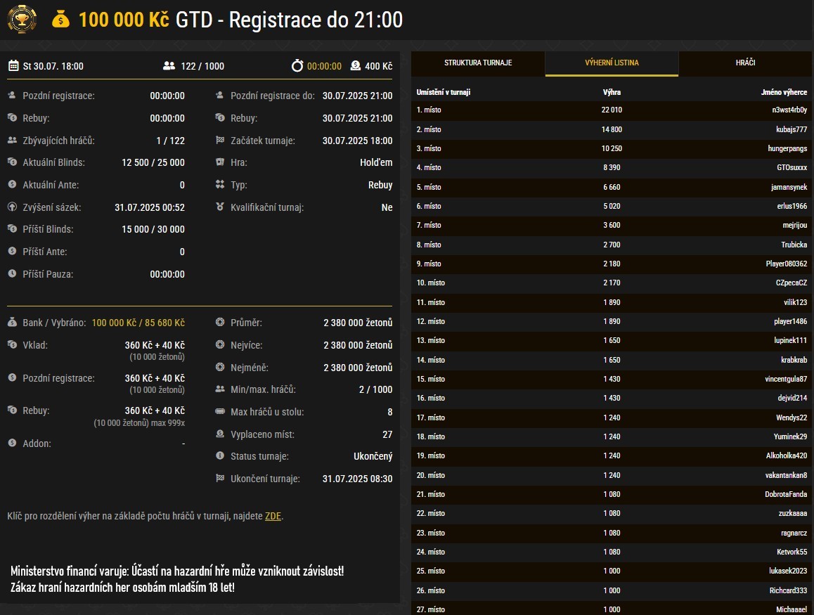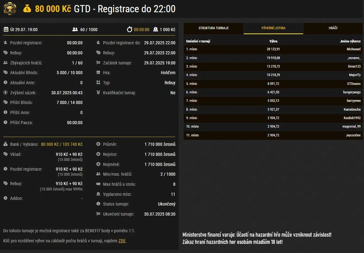 O pár minut později dotáhl do vítězného konce i svou jízdu v turnaji s GTD 80 000 Kč a vstupné 1 000 Kč proměnil na 27 291 Kč. Slušný výkon, co myslíte? Podařilo se vám někdy něco podobného?