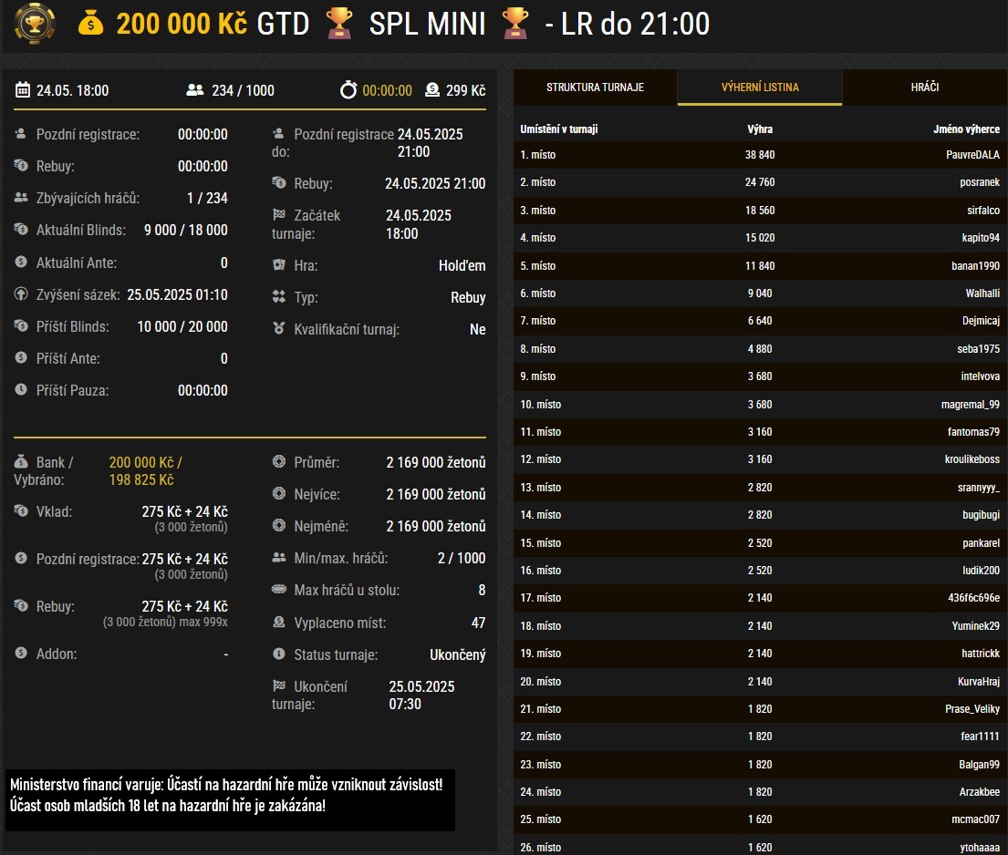 Ani menší hráči se nemuseli v sobotu obejít bez dávky online pokeru. Za 299 Kč mohli naskočit do SPL Mini s GTD 200 000 Kč. Pro první místo a pořádnou porci bodů do leaderboardu SPL si v tomto turnaji došel hráč PauvreDALA, jenž obohatil svůj bankroll o 38 840 Kč.