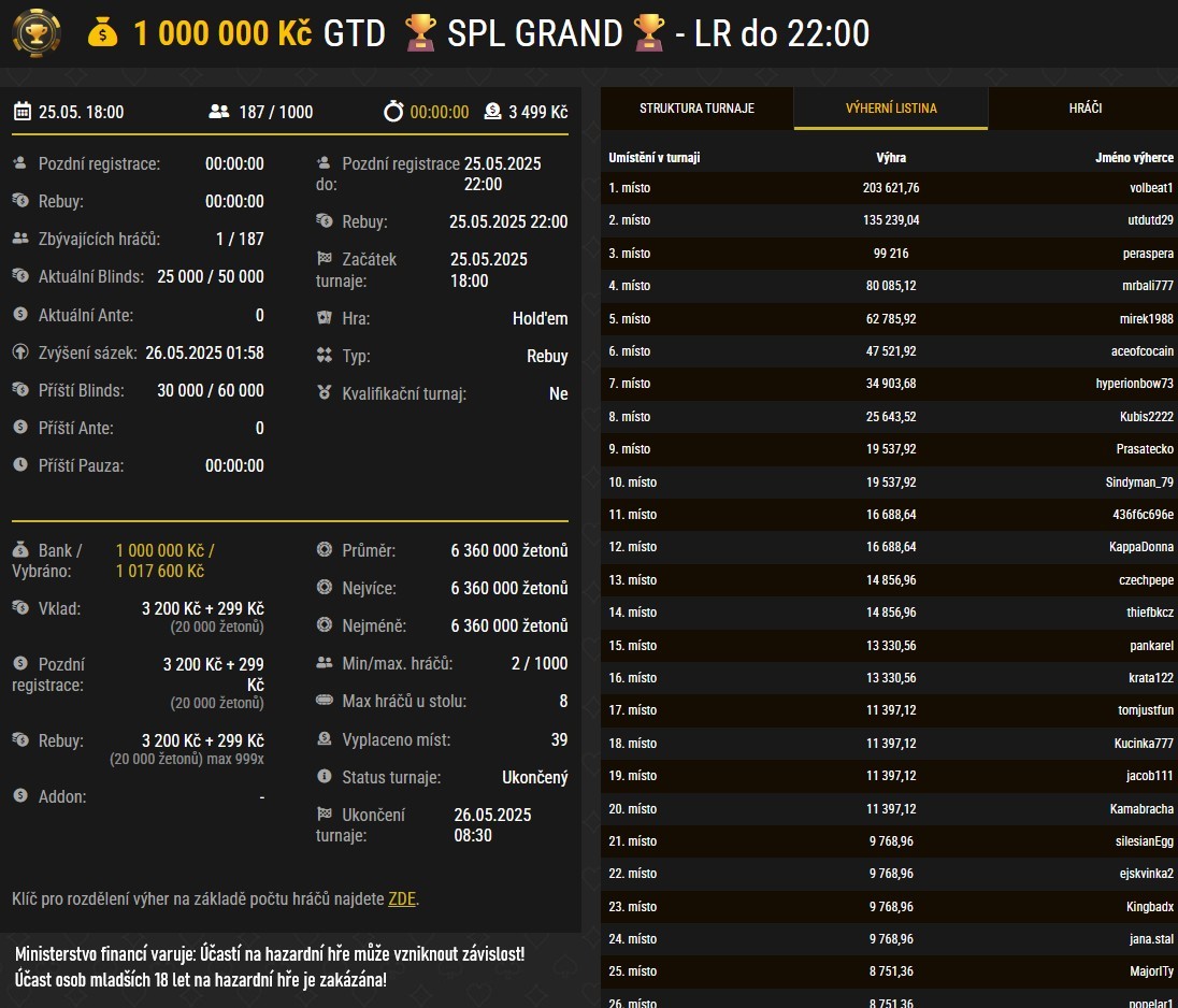Výsledky online poker turnaje SPL GRAND GTD 1 000 000 Kč. Zdroj pokerové lobby herny Synottip.cz