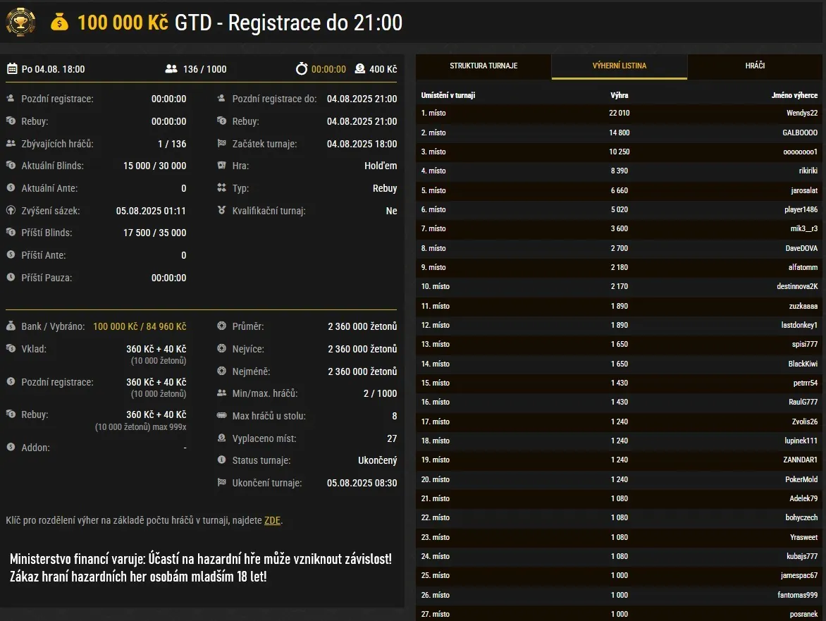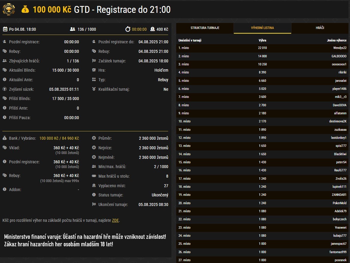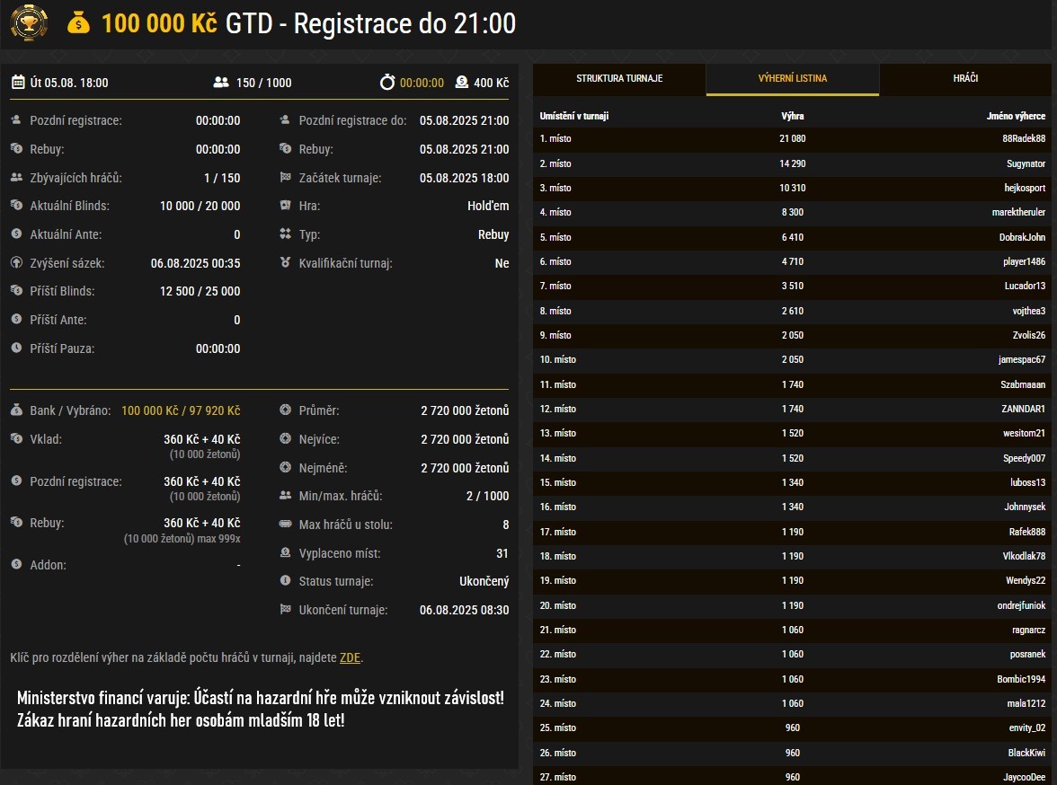 Nejvíce hráčů naskočilo do úterního vydání, kdy se jich do turnaje zaregistrovalo 150. I tak ale k vybrání stotisícové garance chybělo několik buy-inů. Největší kus si z dopláceného prize poolu ukrojil 88Radek88, jenž se může radovat z výhry v hodnotě 21 080 Kč.