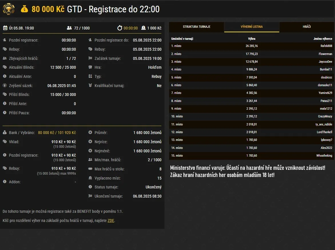 O největší trefu pracovního týdne se postaral hráč „Rafek888“. Ten si poradil s 71 protivníky v úterním pravidelném talířáku s GTD 80 000 Kč a buy-inem 1 000 Kč. Z prize poolu přebraného na 101 920 Kč si pro sebe ukrojil za první místo 26 285 Kč.