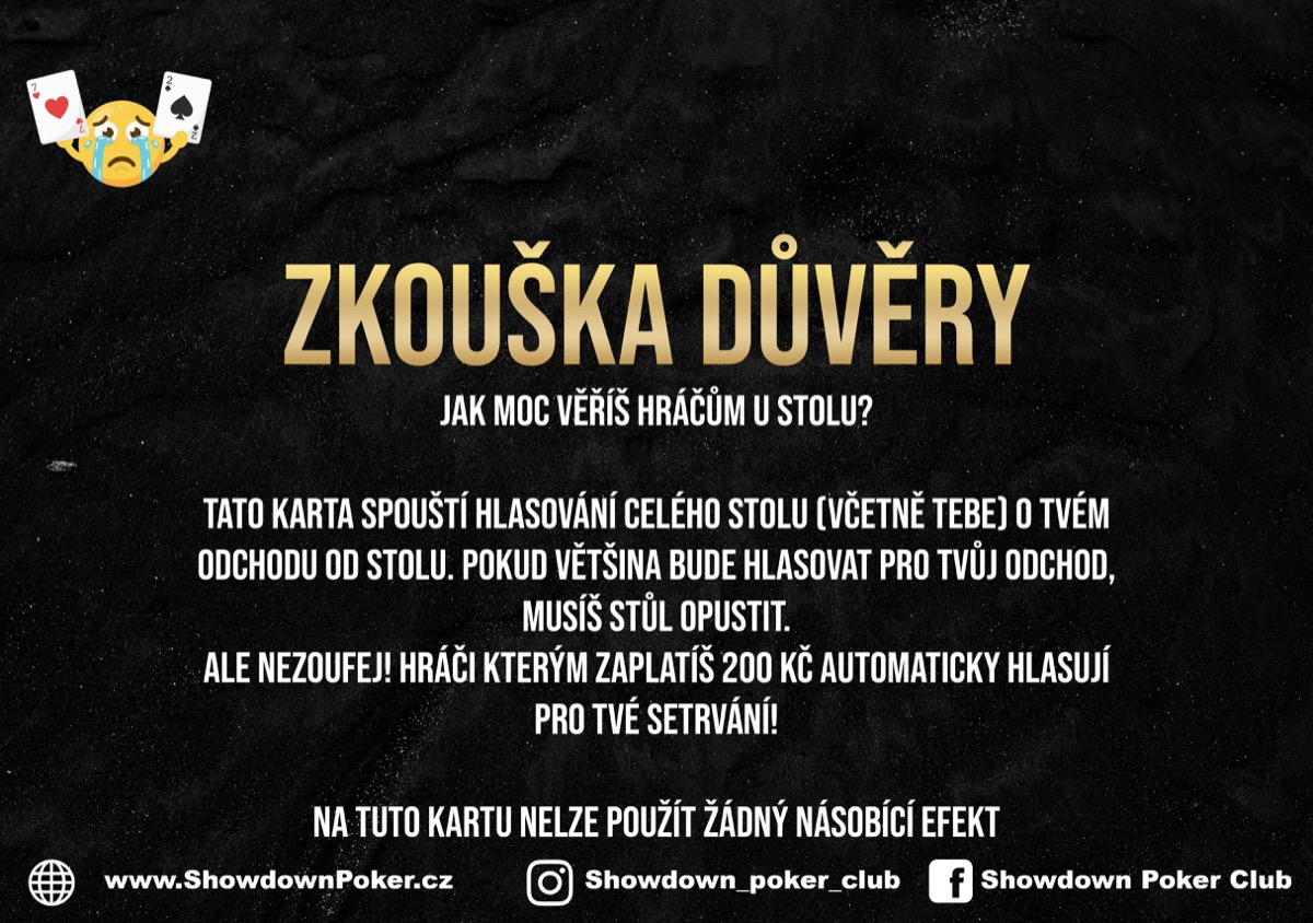 Totálním debaklem pro ego některých účastníků může být vylosování karty "Zkouška důvěry". Po jejím použití může celý stůl hlasovat o tom, že už vás má plné zuby a vy si budete muset sbalit svých pět švestek a uvolnit místo v šapitó pro dalšího hráče.