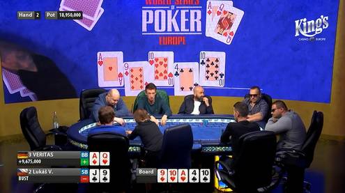 Z 3.297 nábojů, které byly během startovních flightů vystřeleny, jich až do závěrečné fáze skrze dlouhý druhý herní den prosvištělo 24. České naděje ležely na bedrech tří hráčů, bohužel hned první odpolední eliminace zasáhla domácí skupinu. Lukáš V., který v květnové Velké ceně obsadil devátou příčku, hned v druhé handě dne zahájil souboj blindů limpem a na následné 4blindové navýšení svého soka Veritase odpověděl 23blindovým 3-bet shovem s J , 9 . Kreativní potenciál této kombinaci upřít nemůžeme...
