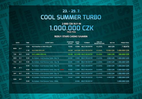 Ve dnech 25. až 29. července rozdáme celkem 1.000.000 korun díky speciálu Cool Summer Turbo. Vstupenkou je buy-in 2.000 korun. Celkem nás čeká 6 startovních dnů včetně jednoho flightu na Lukách a také oblíbené Last Chance. U stolu najdete 50.000 žetonů, blindy stoupají po odehrání 15 minut a late reg jede do konce 12 levelu. Během Last Chance se blind levely zkracují na 10 minut. Do druhého hracího dne projde 10 procent hráčů ze všech entries, kteří mají jistotu ITM.