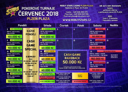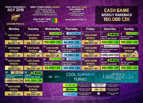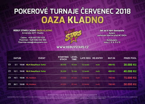 Turnaj si v kladenské pobočce Rebuy Stars zahrajete už tradičně každý čtvrtek. Nechybí oblíbené Turbo za buy-in 400 korun ve čtvrtek 5. července o 30.000 korun, další týden 12. července o celkem 40.000 korun. V následujících dvou týdnech pak hrajeme turnaje s pomalejší strukturou. Ve čtvrtek 19. července vás buy-in 700 korun posune do hry o 75.000 korun. Za stejný buy-in 700 korun pak ve čtvrtek 26. července půjde o prize pool 50.000 korun.