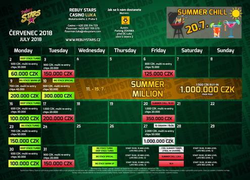 Pražská Luka ovládne turnaj Summer Million s nálepkou 1.000.000 korun. Navíc nás čeká i několik speciálů jako Big Stack Warm Up o 200.000 korun nebo Big Stack Special s cenovkou 300.000 korun. Těšit se můžete i na Summer Chill o celkem 350.000 korun a nepřijdete ani o pravidelné turnaje v pondělí, úterý a v pátek.