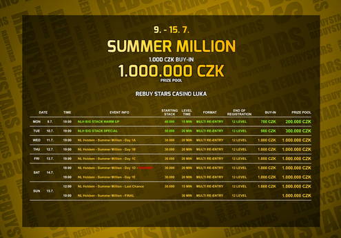Do turnaje Summer Million o celkové odměny ve výši 1.000.000 korun vás dostane příjemný buy-in v hodnotě 1.000 korun. Turnaj proběhne ve dnech 11. až 15. července. Celkem budete mít šanci postoupit do finále díky 6 startovním flightům. Hrací den 1D se odehraje v pražském Savarinu, ostatní na Lukách. Chybět nebude ani oblíbená Last Chance. Starting stack dělá 30.000 žetonů, blindy navyšujeme vždy po odehrání 20 minut a neomezné re-entry je pro vás připraveno až do konce 12 levelu. Do druhého hracího dne, v neděli 15. července, projde z každého flightu 12,5 procent hráčů ze všech entries.