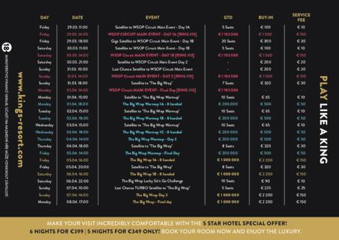 0Návštěvníky rozvadovského King's Resortu na přelomu zimního a jarního období čekají nebývalé turnajové žně. Sklizeň astronomických prizepoolů odstartuje již během tohoto týdne, kdy je na programu €350 TIPS & Kenta Europe Main Eventu s garancí €551.750. Na druhou inkarnaci této akce plynule naváže jarní edice World Series of Poker Circuit, tradičního klání o zlaté prsteny pod záštitou nejznámější světové pokerové značky; od 14. března se bude soutěžit o 15 prstenů, přes €2.000.000 v garantovaných odměnách a také o 17 vstupenek do podzimního €10.350 WSOPE Main Eventu.