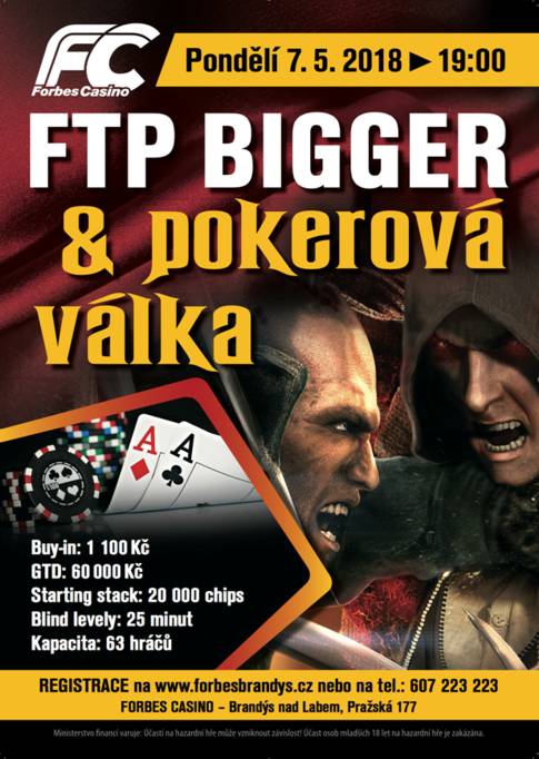 0V pondělí 7. května od 19:00 hodin se v brandýském kasinu Forbes uskuteční další turnajový speciál, tentokrát s buy-inem 1.100 Kč, možností dvou re-entry a prize poolem 60.000 Kč. A jak je totiž v Brandýse dobrým zvykem, i aktuální edice turnaje Bigger bude spojena s tematickou akcí. Páteční večer nese podtitul „Pokerová válka". Hráč, který během turnaje vyřadí nejvíce soupeřů, obdrží voucher na jízdu v obrněném transportéru a střelbu z AK-47 pro dvě osoby.