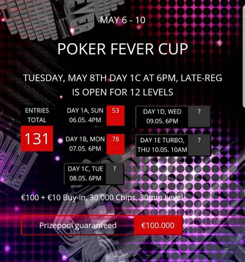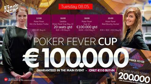 0Úvodní dvě rozehrávky za sebou má €110 Poker Fever Cup, další z mnoha vícedenních turnajů festivalu Poker Fever Series, který již druhým týdnem probíhá v rozvadovském King's. Prakticky letní počasí, světový šampionát v hokeji, druhý prakticky prodloužený víkend v řadě - Poker Fever Cup má těžkou konkurenci a mnoho hráčů jej zatím do svého harmonogramu nezařadilo. Tím spíše byste měli zpozornět a začít uvažovat nad návštěvou rozvadovského pokerového ráje.