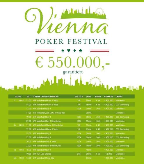 V úvodu článku jsme zmínili, že Vienna Poker Festival probíhá ve vídeňském Montesinu. Ona to svým způsobem ale není pravda - VPF Main Event, €400tisícovou garancí obdařený hlavní turnaj celého festivalu, totiž v určitých fázích navštívil i řadu jiných rakouských poker roomů a rozhodně se neostýcháme tento turnaj označit za jedinečný.
