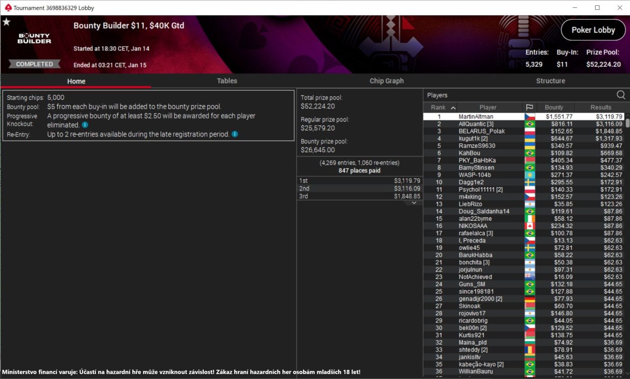 O víkendu naši dali ještě několik pěkných výher, nicméně první místa jsou již pouze dvě. Jedno z nich patří Martinu "MartinAltman" Altmanovi, který taktéž v rozsáhlém poli 5.329 hráčů zdominoval ostatní hráče a odnesl si $4.762.