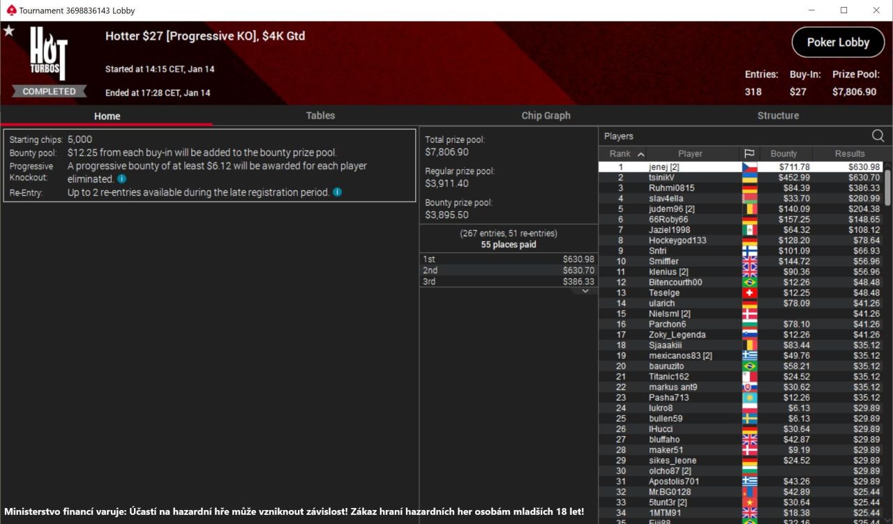 A poslední první místo tohoto víkendu nepatří stálici, o které bychom reportovali každý týden, jak to u některých bývá, nýbrž hráči "jenej". Ten si za svůj výkon odnáší $1.343 a slávu šampiona. Být první není totiž nikdy ezy.