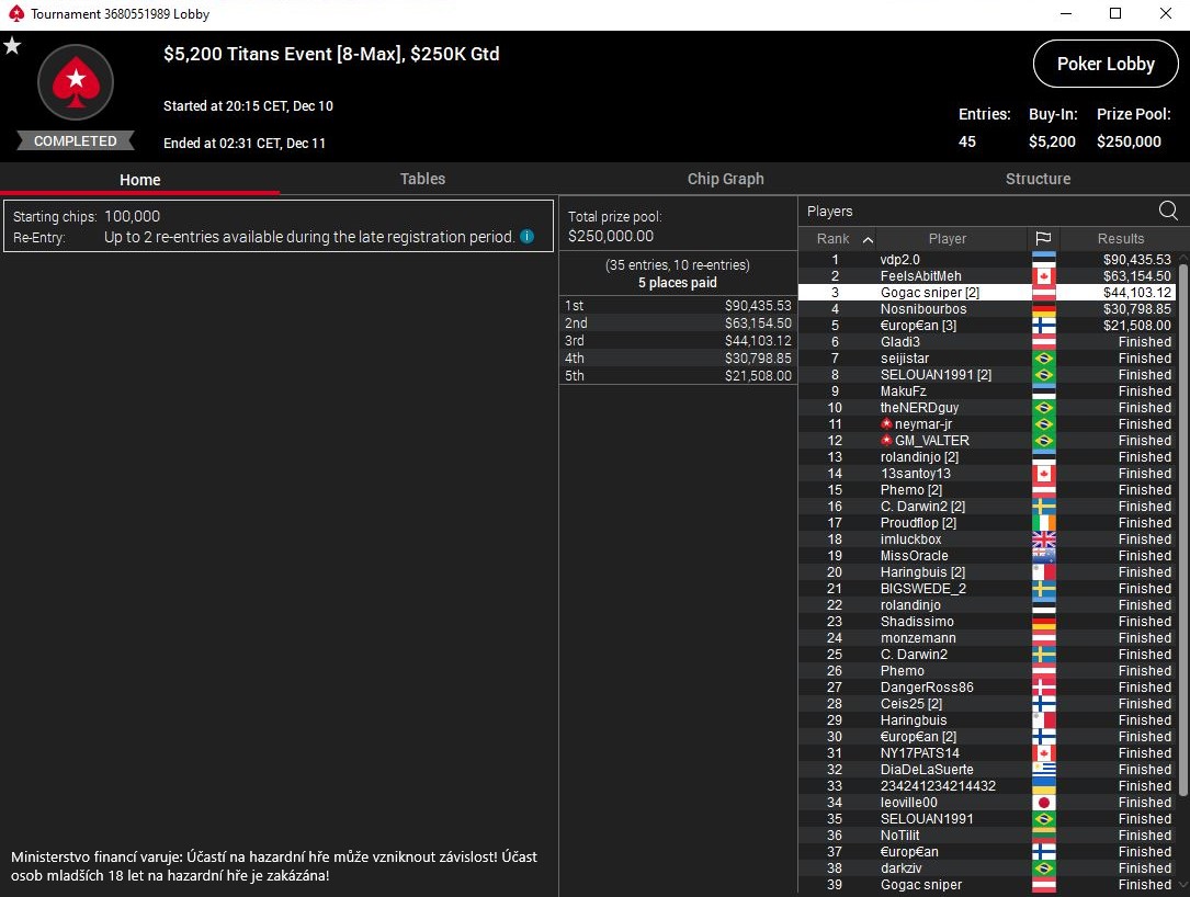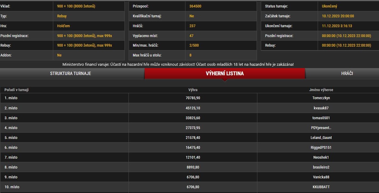Nejlépe využil příležitosti "Tomeczkyn" a za nejlepší umístěné v tomto pokerovém turnaji získal odměnu 70.786 Kč. Druhým byl "kvasak87" s odměnou 45.125 Kč a třetím nejlepším se stal "tomas0501" za 33.825 Kč.