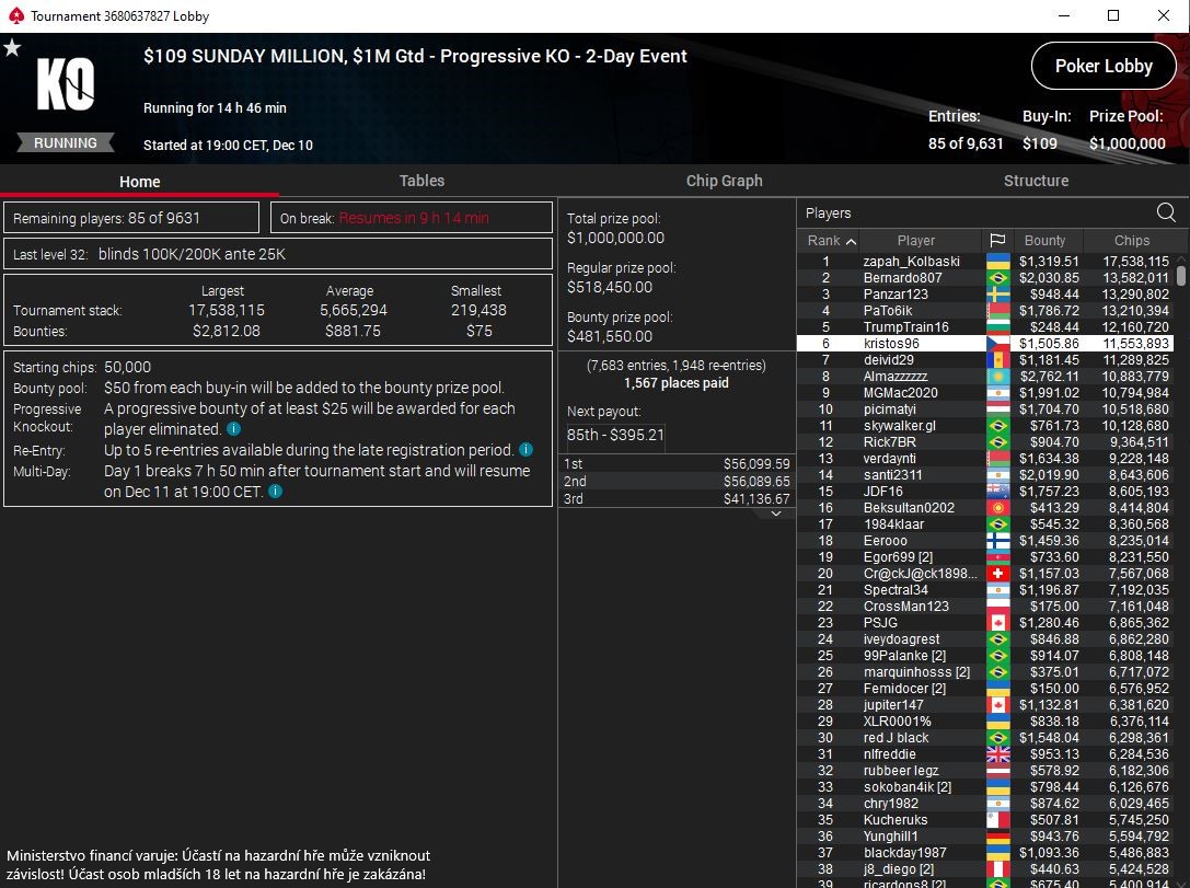 Z první dne Sunday Milionu postoupilo 85 hráčů. Z toho dva naši. Na šestém místě se drží "kristos96" s zhruba s 46bb. Na posledním postupovém místě je druhý čech "CZPablos" sedící na necelém jednom bb. Každopádně úspěch skvělý. Za celou redakci týmu Pokerman.cz držíme palce!