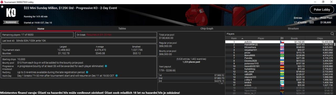 Z 17 postupujících je na první místě hráč "jeyticko" již s odměnou $1.142 za bounty, které do nynějška nasbíral. Hodně štěstí!