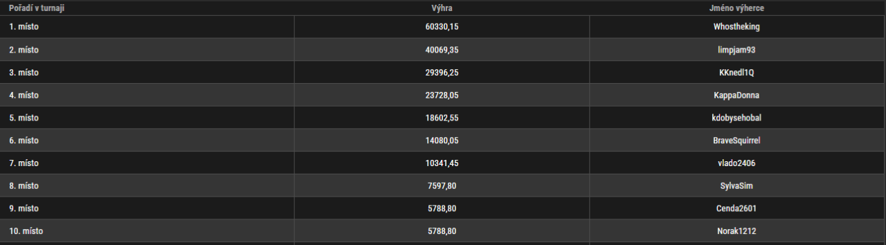Na jeho závěru stál na kopci z těl svých nepřátel "Whostheking", který jak jinak než vyhrál. Za vítězství inkasoval 60.330 Kč. Druhým nejlepším byl hráč hrající pod nickem "limpjam93", který si odnesl 40.069 Kč. Poslední příčka ze stupínku vítězů ohodnocená za 29.396 Kč byla obsazena hráčem "KKnedl1q". Pěkné nedělní přivýdělky toto.
