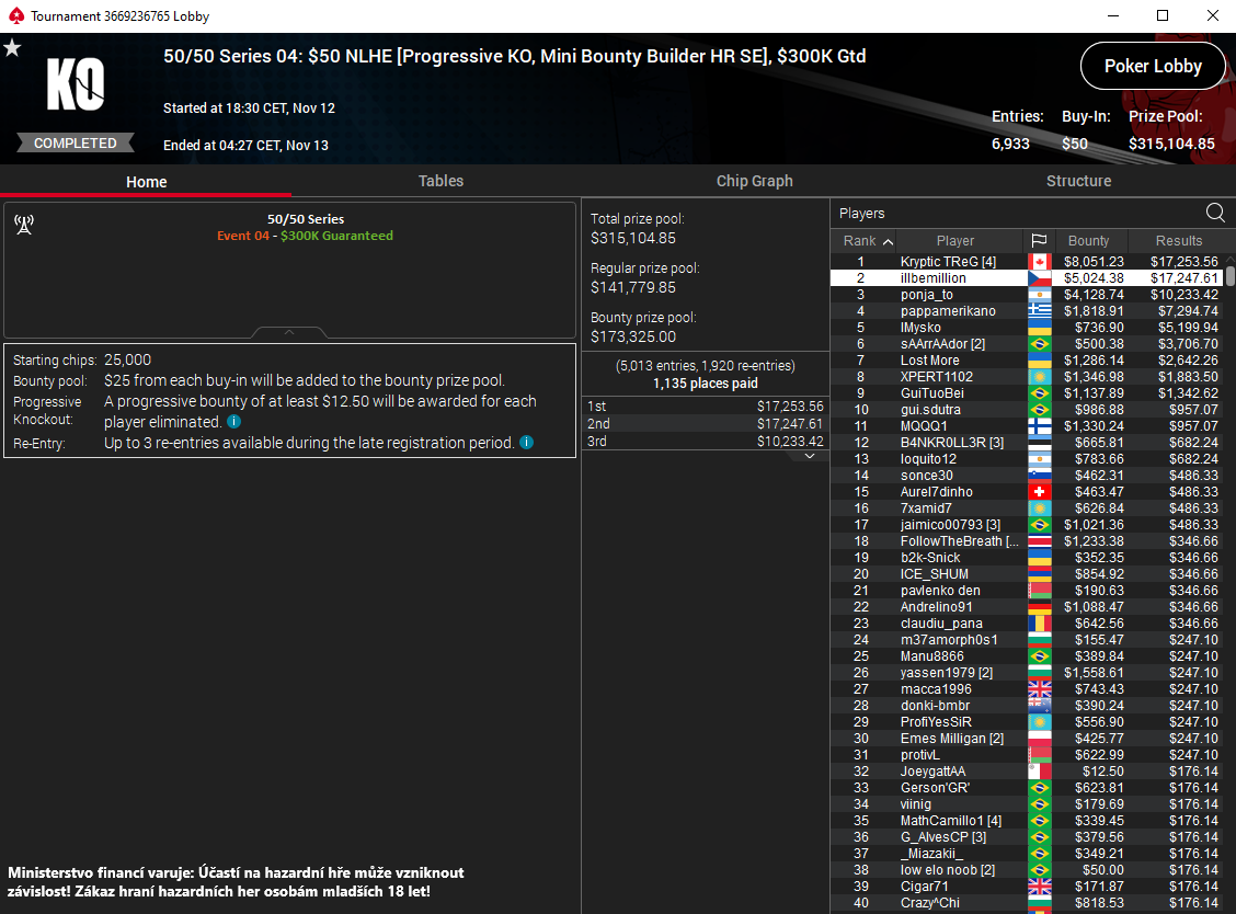 Parádní trefy zajistili borci z titulku výše. Začneme tou největší. V jednom z prvních turnajů právě začínající série 50/50 na online poker herně Pokerstars.cz K.O. řadil hráč "illbemillion". V eventu 04 s buy-inem $50 s GTD $300.000 si v poli téměř 7000 hráčů neporadil pouze s jedním sokem. Za druhé místo si odnesl více jak $17K a bounty v hodnotě cca. $5K. V přepočtu se jedná zhruba o 545.000 Kč.zdroj: lobby poker herny Pokerstars.cz