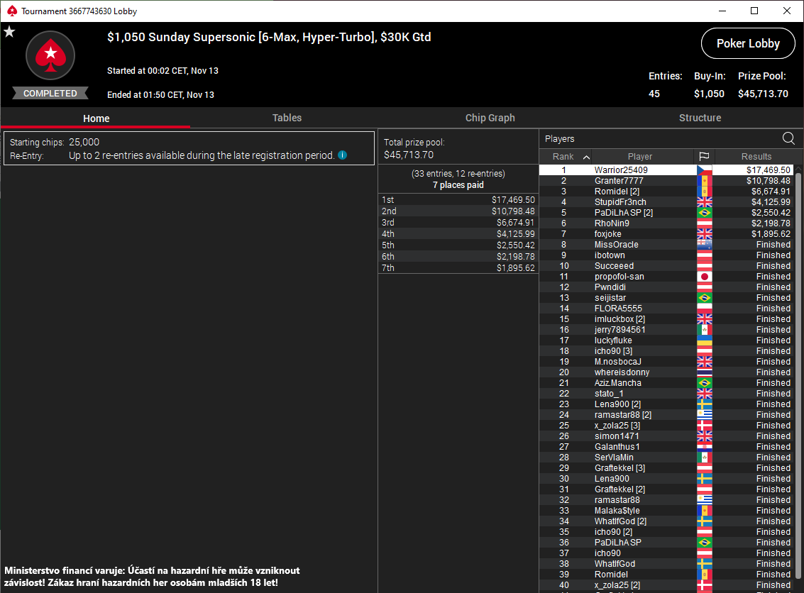Druhou největší trefou, technicky již ne víkendovou, protože turnaj začal dnes v 00:02, se pyšní "Warrior25409". Ten za první místo ve svižném Sunday Supersonicu (hyper-turbo, 6-max) za buy-in $1.050 získal $17.470 v poli 45 hráčů. V přepočtu se jedná zhruba o 428.000 Kč. Slušná výhra za cca 2 hodinky hry, co myslíte?