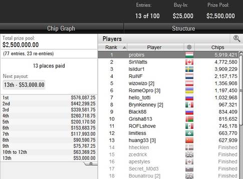 S takřka šestimilionovým stackem si pozici chip leadera zajistil maďarský profesionál Andras „probirs" Neméth, mimo jiné současná šestka prestižního žebříčku PocketFives Online Poker Rankings. Průběžně druhý je šampion předloňského PCA Mike „SirWatts" Watson, čtvrtá příčka patří ostřílenému Portugalci Rui „RuiNF" Ferreirovi, pátý je Ole „wizowizo" Schemion, tedy chlapík, kterého jste před pár dny mohli sledovat na finálovém stole EPT Monte Carlo a mezi postupujícími nechybí třeba ani Bryn Kenney. Jedno jméno jsme v předešlém výčtu záměrně vynechali, protože si zaslouží podstatně větší péči.
