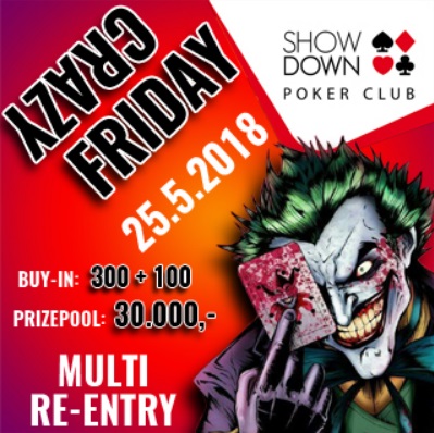 A to navíc není tento týden vše! Hned druhý den se totiž bude konat netradiční vydání našeho pátečního turnaje s prizepoolem minimálně 30.000 Kč a buyinem pouhých 300 Kč. A sice Crazy Friday! Proč netradiční a crazy? Protože tentokrát budeš mít do konce pozdní registrace (22:00) neomezenou možnost re-entry. Těšíme se na Tebe, bude to jízda!