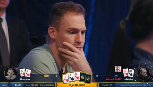Avšak: Bonomo je Bonomo a diváci včerejšího přímého přenosu mohli opět sledovat hráče, kterého doprovázela aura neporazitelnosti. Přibližně $2milionový prizepool měl být rozdělen mezi osmičku nejúspěšnějších a po prolomení peněžní bubliny, kterou Justin přečkal v plném zdraví, sám Bonomo odklidil z cesty jednoho z nejnepříjemnějších soupeřů.