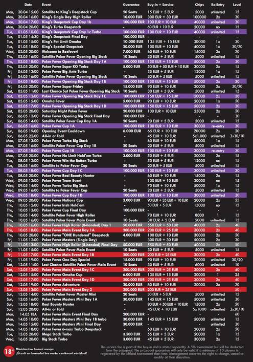 Mohutná garance Poker Fever Main Eventu představuje pouze necelou polovinu ze všech prizepoolů, o které se během příštího týdne bude hrát. Již dnes v 16:00 například odstartuje první flight €110 Poker Fever Cupu, přičemž garance tohoto turnaje obsahuje rovných €100.000. Dny 1b, 1c a 1d jsou na programu od pondělí do středy včetně vždy od 18:00, ve všech flightech bude odehráno po 15 půlhodinových levelech. Late reg je otevřen vždy po dobu 12 úrovní a startovních 30.000 v žetonech si během něj můžete díky neomezeným re-entries vyzvednout libovolněkrát. Finále €100tisícového Poker Fever Cupu bude rozehráno ve čtvrtek 10. května ve 13:00.