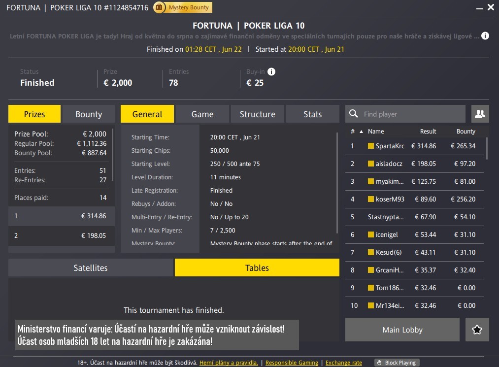 Největší kus z banku odměn si pro sebe ukrojil hráč SpartaKrc, který se může radovat z prize money €314 a dalších €265 vylosovaných v mystery bounty obálkách. Na výplatní listinu se dostalo dalších 13 hráčů, mimo jiné: GrcaniHoven (8. místo za €67), Icenagel (6. místo za €84), Lucky "Stastnyptacek" Bird (5. místo za €121) a aidladocz (2. místo za €295).