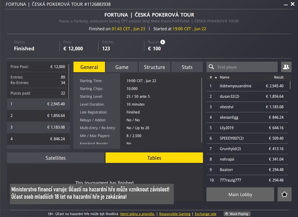 Do červnového vydání České Pokerové Tour online se zapojilo 86 unikátních hráčů. Ti společnými silami vybrali 123 entries v hodnotě €100, což jen těsně nestačilo na pokrytí garance turnaje v hodnotě €12 000 (po odčtení fee). Na 22 placených pozic se dostala řada známých nicků, které můžete potkat u virtuálních stolů Fortuna Pokeru.