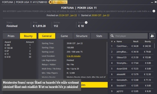 Vybrané výsledky online turnajů na Fortuna Pokeru víkend 21. - 22. června